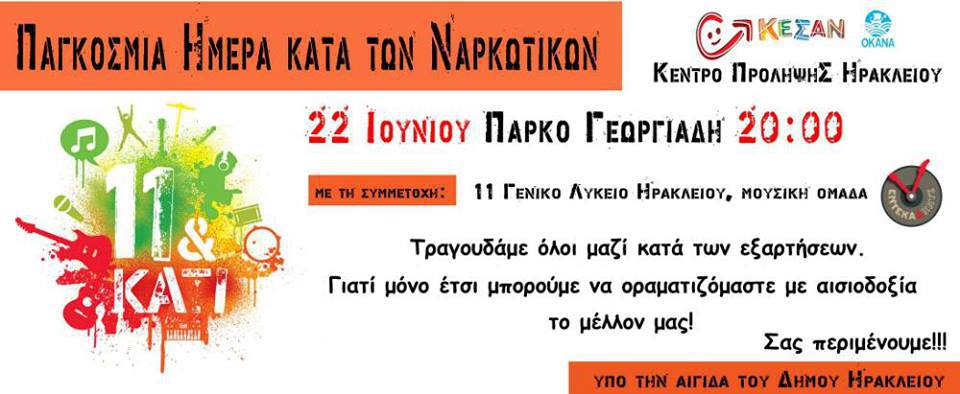 Το ΚΕΣΑΝ – Κέντρο Πρόληψης των Εξαρτήσεων και Προαγωγής της Ψυχοκοινωνικής Υγείας (Κ.Π. ΟΚΑΝΑ), σε συνεργασία με τη μουσική ομάδα “11 & κάτι” του 11ου Γενικού Λυκείου Ηρακλείου, με αφορμή την Παγκόσμια Ημέρα Κατά των Ναρκωτικών, διοργάνωσαν μουσική εκδήλωση το Σάββατο 22 Ιουνίου 2013, στο Πάρκο Γεωργιάδη.