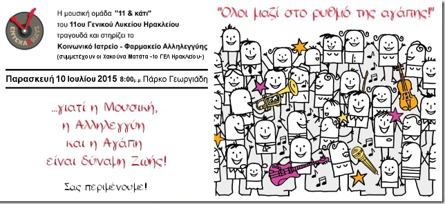 - Συναυλία Αλληλεγγύης «Όλοι μαζί στο ρυθμό της αγάπης!»: Οργάνωση συναυλίας με το μουσικό σχήμα “11 & κάτι”, στις 10 Ιουλίου 2015, 8:00 μ.μ., στο Πάρκο Γεωργιάδη, με σκοπό να συγκεντρωθούν χρήματα για το Κοινωνικό Ιατρείο – Φαρμακείο Αλληλεγγύης Ηρακλείου. Στη συναυλία συμμετείχε και το συγκρότημα “Χακούνα Ματάτα” του 1ου Γενικού Λυκείου Ηρακλείου. Γιατί στις δύσκολες περιόδους που διανύουμε η Αλληλεγγύη, η Αγάπη και η Μουσική είναι δύναμη Ζωής!