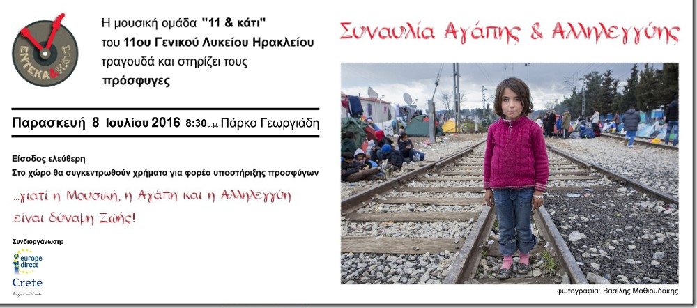Το μουσικό σχήμα “11 & κάτι” του 11ου Γενικού Λυκείου Ηρακλείου, σε συνεργασία με το Europe Direct of Crete, διοργάνωσαν συναυλία αλληλεγγύης για τους πρόσφυγες την Παρασκευή 8 Ιουλίου 2016, στις 8:30 μ.μ., στο πάρκο Γεωργιάδη, στο κέντρο του Ηρακλείου.