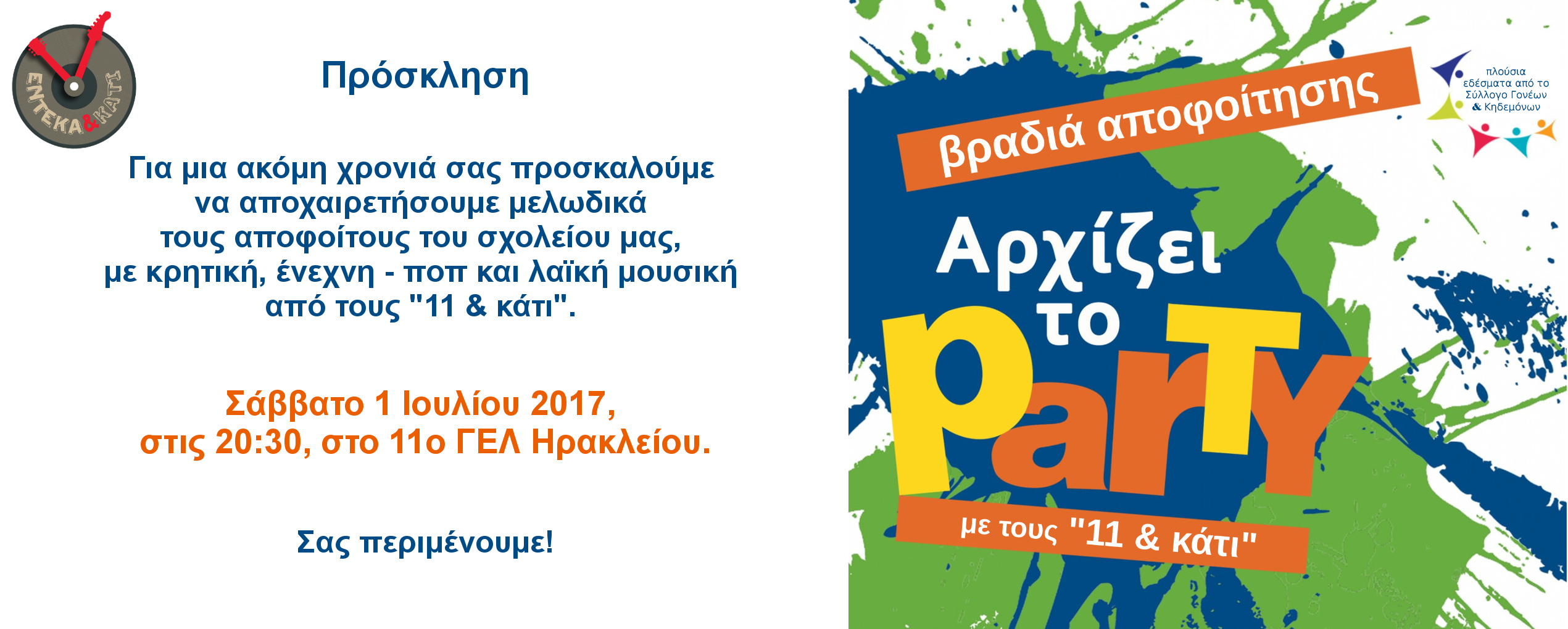 «Αρχίζει το party με τους “11 & κάτι”» 15/06/201713/02/202211 & κάτι 1 Ιουλίου 2017: Σχολική γιορτή αποφοίτησης «Αρχίζει το party με τους “11 & κάτι”» Κοινοποιήστε: Πατήστε για κοινοποίηση στο Facebook(Ανοίγει σε νέο παράθυρο) Facebook Κάνε κλικ για να μοιραστείς στο X(Ανοίγει σε νέο παράθυρο) Χ Κλικ για κοινοποίηση στο Pinterest(Ανοίγει σε νέο παράθυρο) Pinterest Κλικ για αποστολή ενός συνδέσμου μέσω email σε έναν/μία φίλο/η(Ανοίγει σε νέο παράθυρο) Email Μου αρέσει! Φόρτωση... Σχετικά