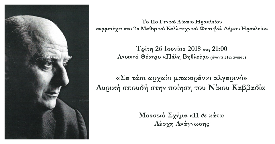 Με βάση τις μελέτες της Λέσχης Ανάγνωσης του 11ου Γενικού Λυκείου Ηρακλείου στην ποίηση του Ν. Καββαδία, παρουσιάζονται εννέα (9) μελοποιημένα από διάφορους συνθέτες ποιήματα, σε συνδυασμό με βασικούς σταθμούς και θέματα στην ποίησή του.