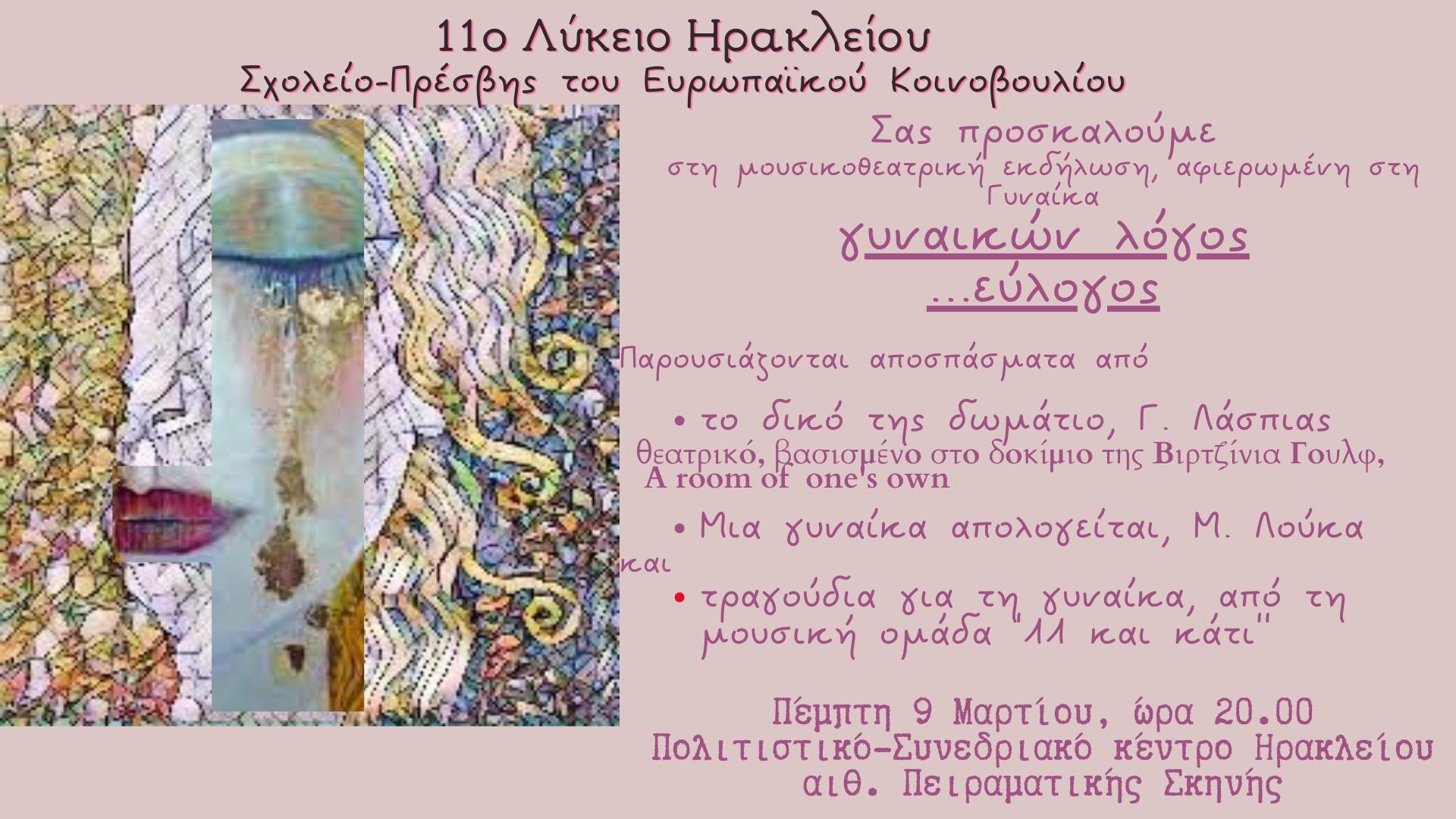 Πέμπτη 09 Μαρτίου 2023: Μουσικοθεατρική εκδήλωση, aφιερωμένη στη γυναίκα, «Γυναικών λόγος …εύλογος».