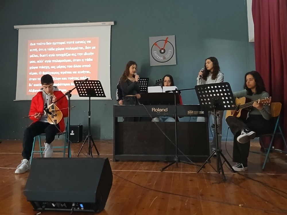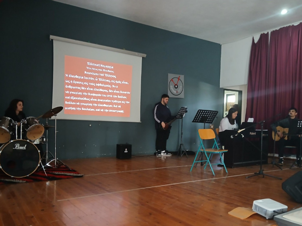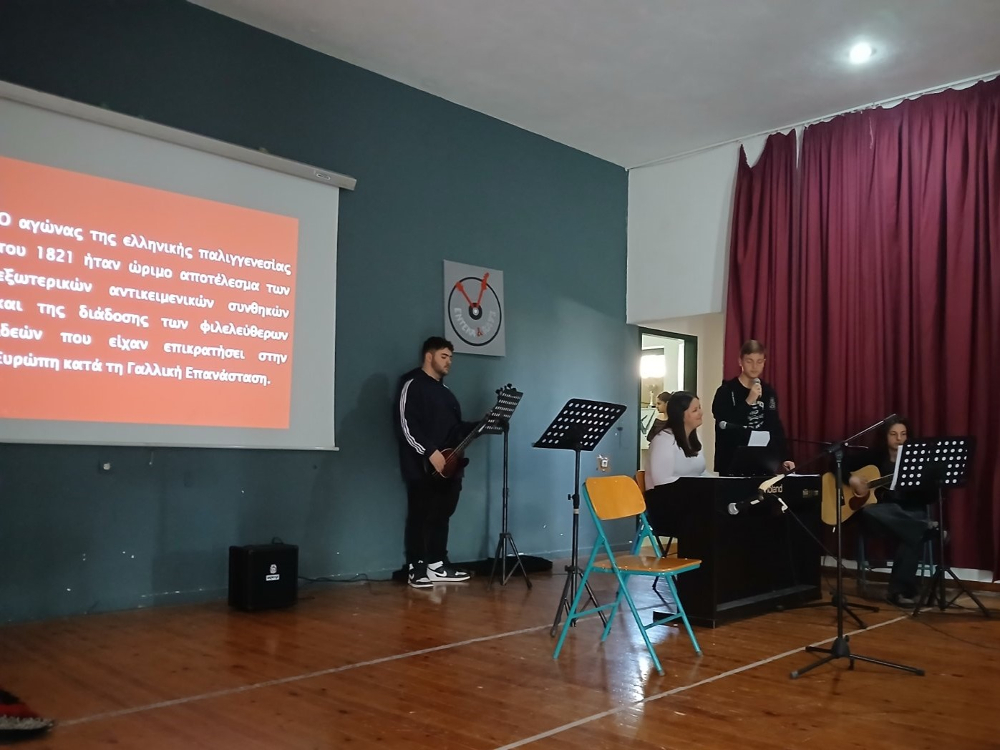 Η φετινή μας εκδήλωση αναφέρεται σε κείμενα που προετοίμασαν ή ύμνησαν την εθνική παλιγγενεσία (Ρήγας, Ελληνική Νομαρχία, Ανδρέας Κάλβος, Διονύσιος Σολωμός), ενώ αντίστοιχες μελοποιήσεις θα εκτελεστούν από το μουσικό σχήμα του σχολείου «11 & κάτι».